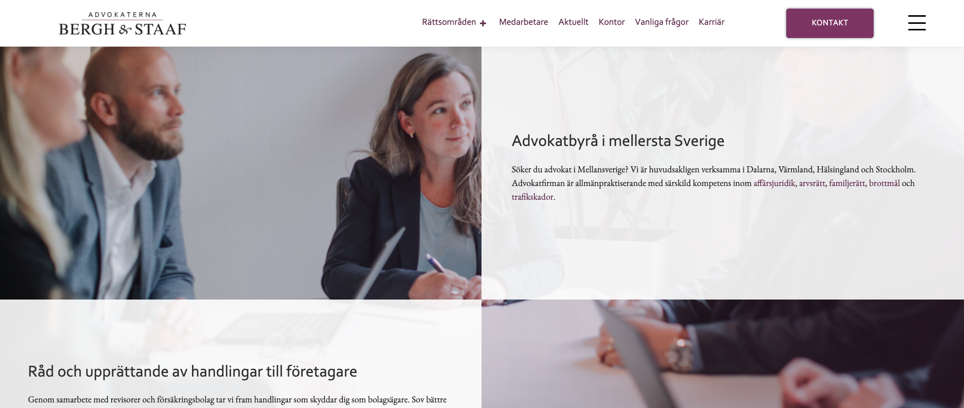Advokaterna Bergh & Staaf är en allmänpraktiserande advokatfirma verksamma i Dalarna, Värmland, Hälsingland och Stockholm, med expertis inom affärsjuridik, familjerätt, arvsrätt, brottmål och trafikskador.