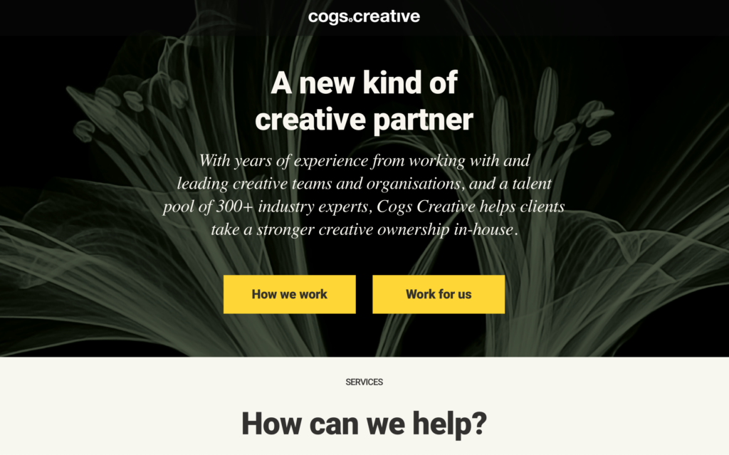 Får vi presentera Cogs Creative – en av våra uppdragsgivare. Cogs Creative grundades av de namnkunniga reklamarna Anna Romson och Magnus Engström. De hjälper företag som vill ha ett starkare internt ägarskap av sitt varumärke. Detta kan ske på många sätt. Som att hjälpa företag att starta eller utveckla sitt in-housebyrå eller sätta ihop team av kreatörer som kuggar in organisationen och operativt jobbar med specifika uppdrag.